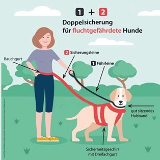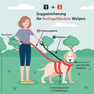 Hierfür gibt es spezielle Sicherheitsgeschirre, aus denen ich NICHT entwischen kann, sogenannte 3- Punkt Sicherheitsgeschirre/Panikgeschirre die ein Herausschlüpfen nahezu unmöglich machen. Zudem brauche ich ein gut sitzendes Halsband. Ich sollte BEIDES tragen, sowohl ein Sicherheitsgeschirr als auch ein vernünftiges Halsband. Daran werden dann in den ersten Wochen zwei Leinen befestigt. Die normale Führleine und die Sicherheits-Bauchleine. Eine ans Halsband, eine ans Sicherheitsgeschirr (bei Welpen beide ans Geschirr)! So ist es auch wenn mein Hundehalter die Leine mal verliert, weil er selbst z. B. stürzt oder ich stark an der Leine rucke, weil ich mich erschreckt habe nicht möglich, dass ich weglaufen kann. Ich bin so über beide Systeme eigenständig und optimal gesichert!